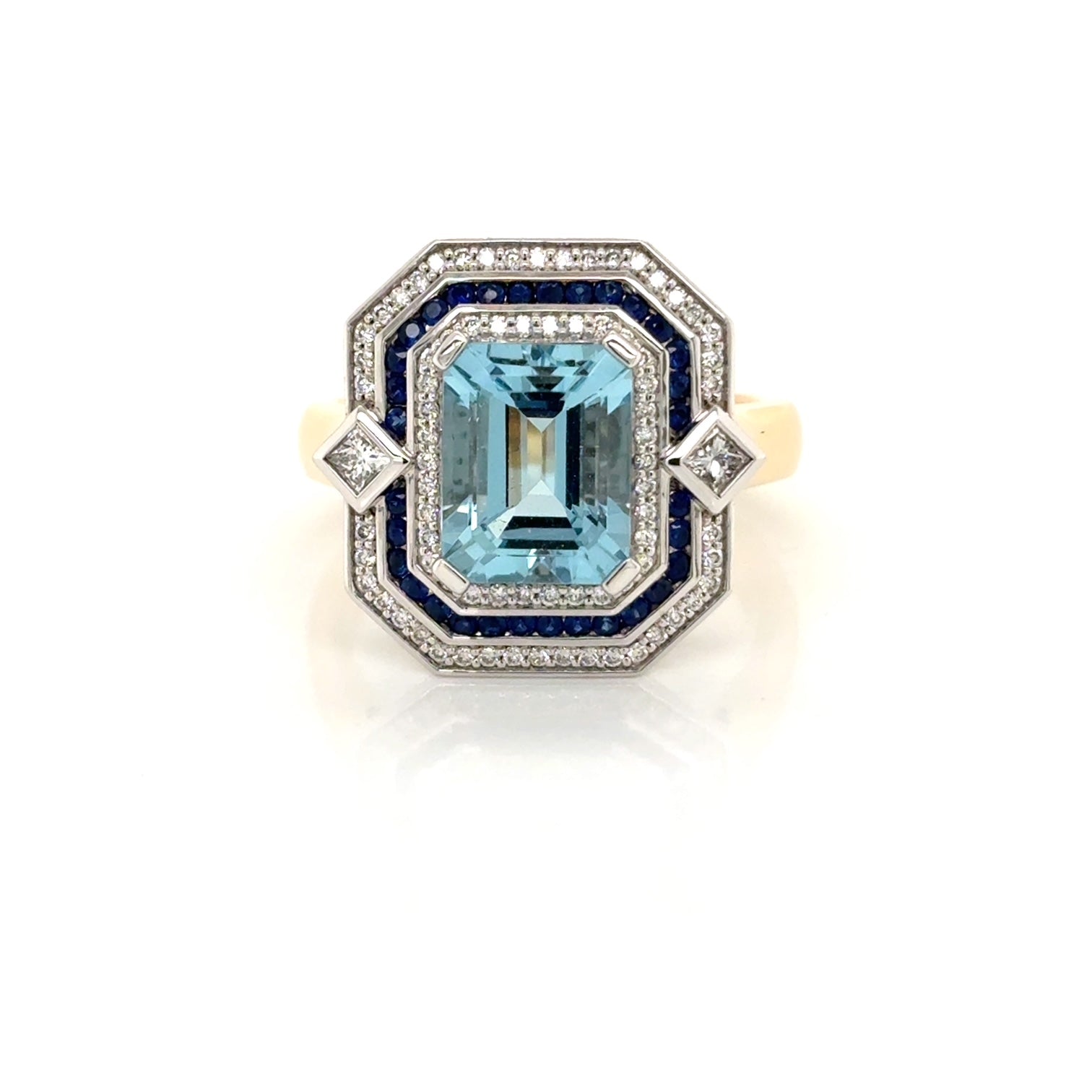 Crafted in 18ct Yellow & White Gold, featuring an emerald cut natural aquamarine weighing 2.37ct and surrounded by a triple halo consisting of natural round brilliant cut diamonds and sapphires.