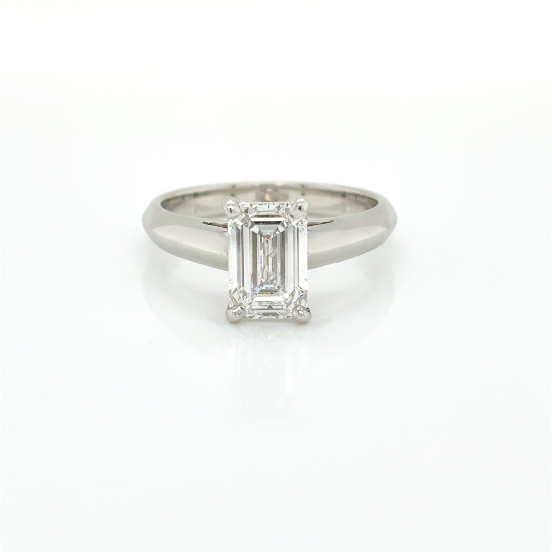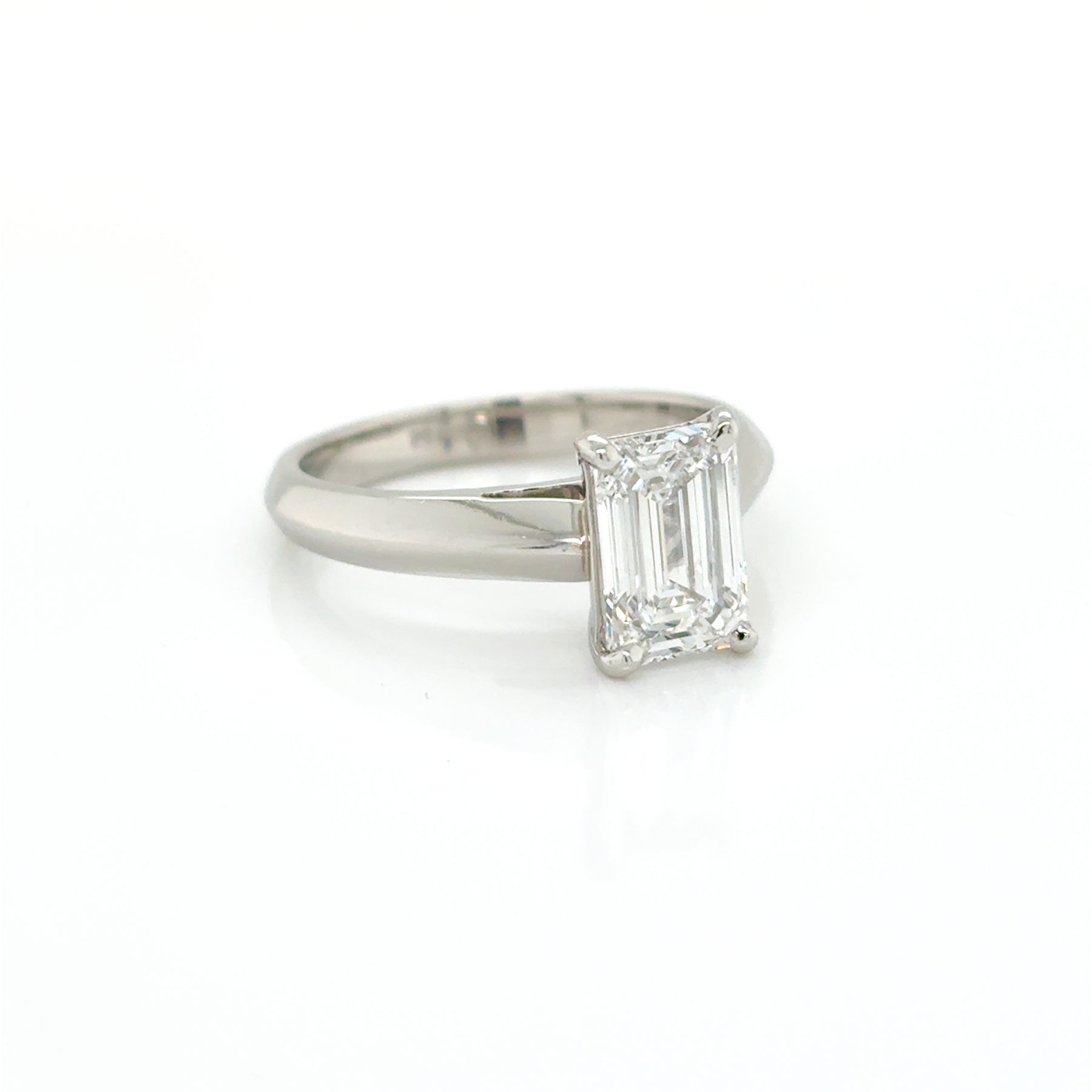 Crafted in platinum, this custom bezel set solitaire diamond engagement ring features an independently certified 2.11ct D/VS1 emerald cut laboratory grown diamond on a solid 3.0mm band.