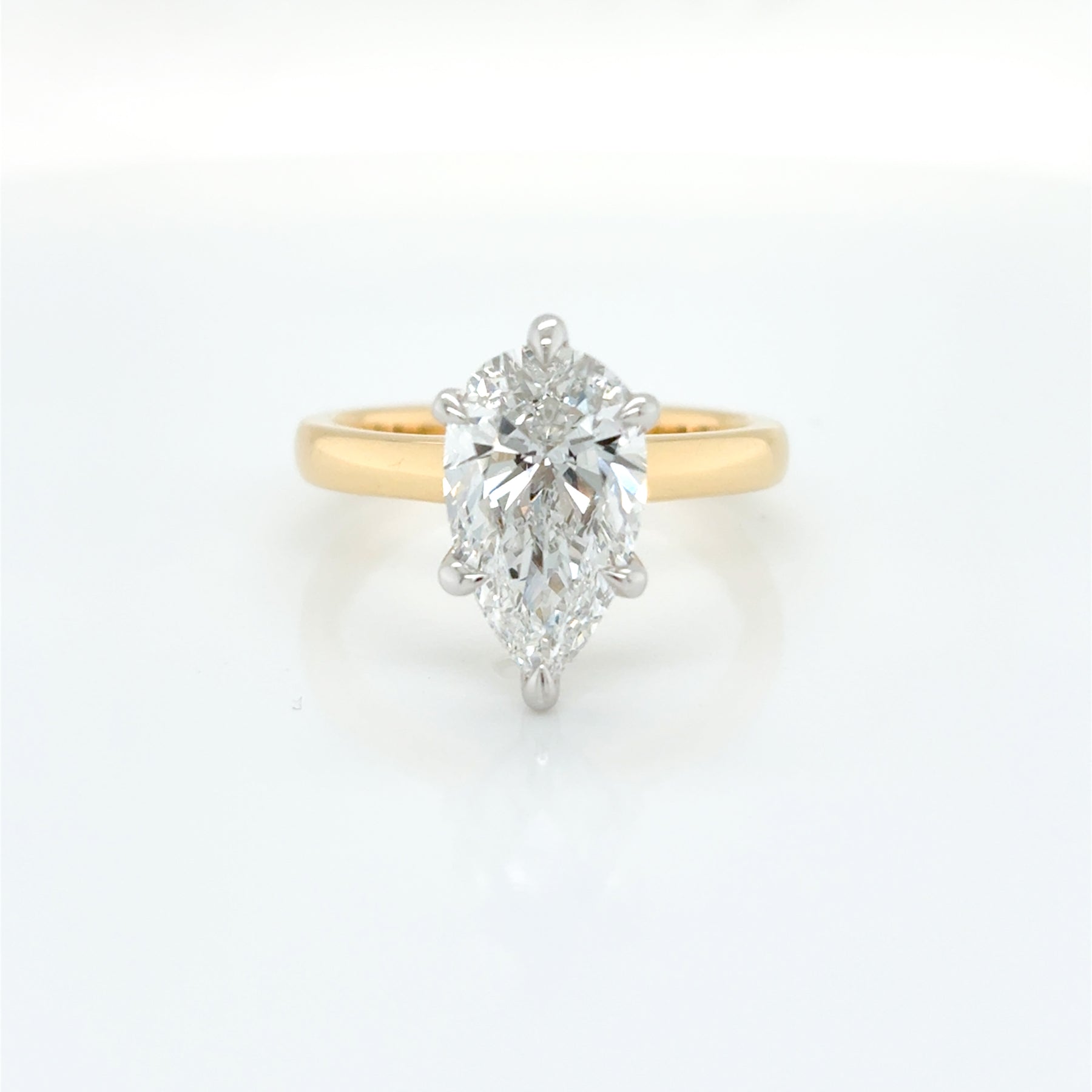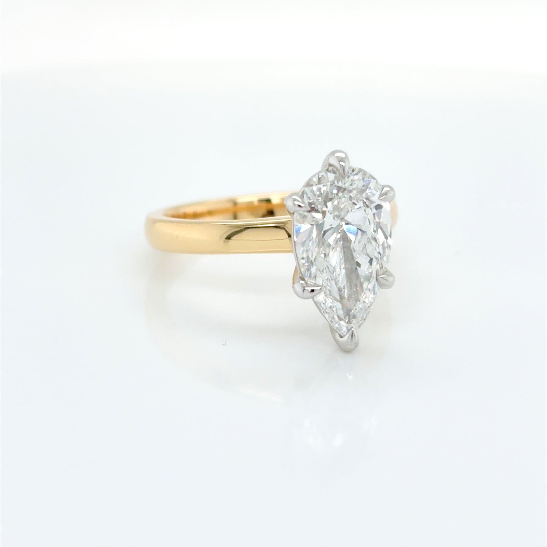 Crafted in 18ct Yellow & White Gold, this custom claw set solitaire diamond engagement ring features an independently certified 3.00ct D/VS1 pear cut laboratory grown diamond on a solid 2.70mm band with slightly up swept shoulders.