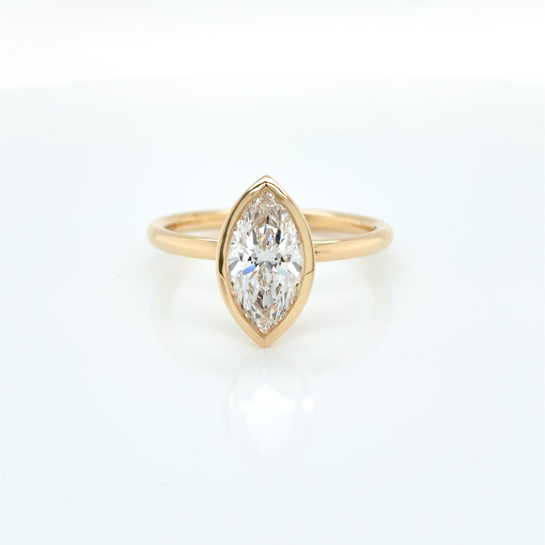 Crafted in 18ct Yellow Gold, this custom bezel set solitaire diamond engagement ring features an independently certified 1.51ct E/VS1 marquise cut laboratory grown diamond on a solid 1.70mm band.