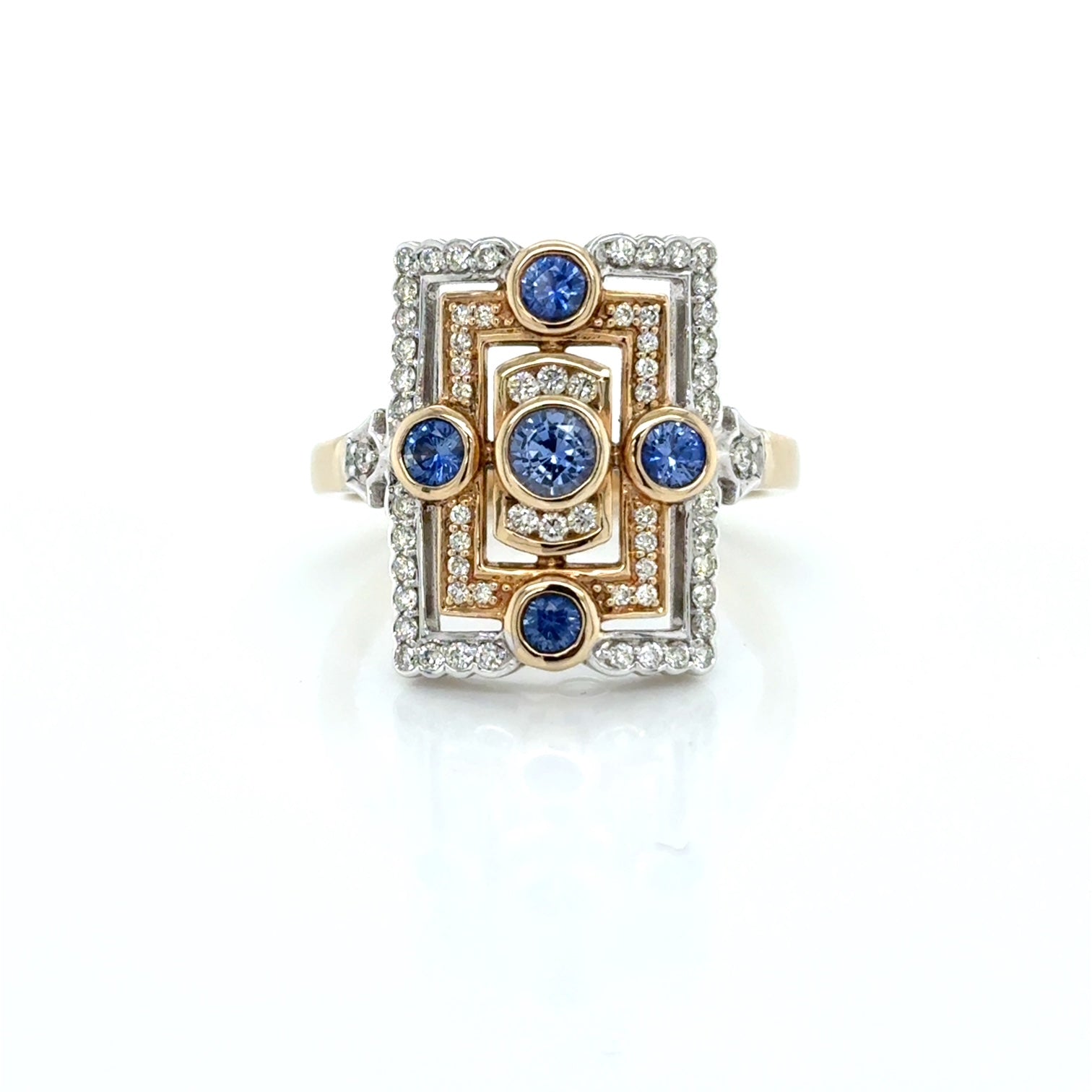 Crafted in 9ct Yellow & White Gold, this bezel set sapphire and diamond ring features five natural round cut Ceylon Sapphires and 64=0.32ct natural claw set round brilliant cut diamonds.